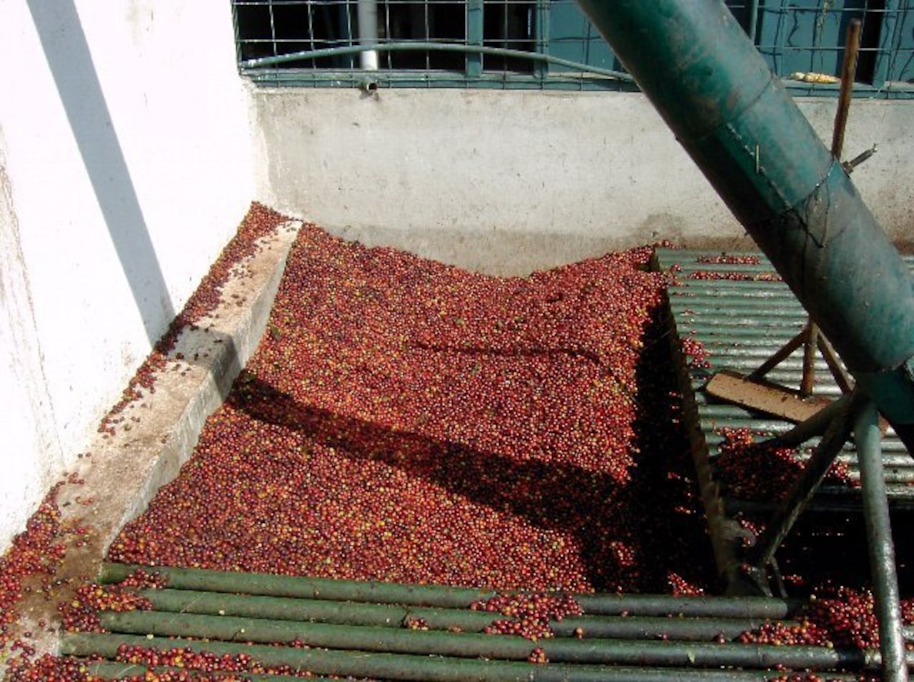 農園内の設備で真っ赤なチェリーが処理され、セメントとレンガの乾燥場にて天日乾燥を行う。